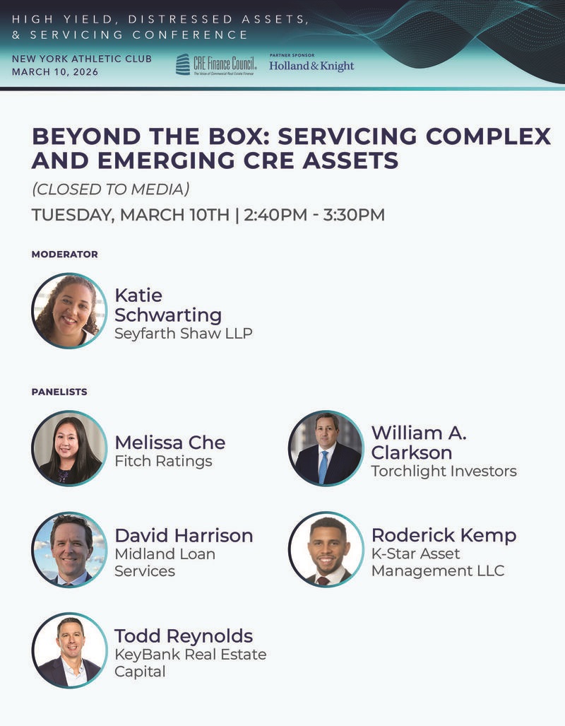 We are excited to share that William Clarkson, Managing Partner, Special Servicing and Workout Services, will be speaking at CRE Finance Council‘s High Yield, Distressed Assets, & Servicing Conference, “Beyond the Box: Servicing Complex and Emerging Assets” on March 10th in New York City.